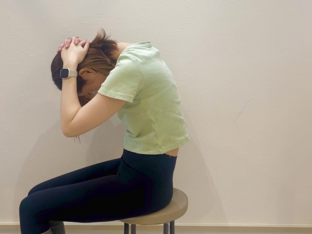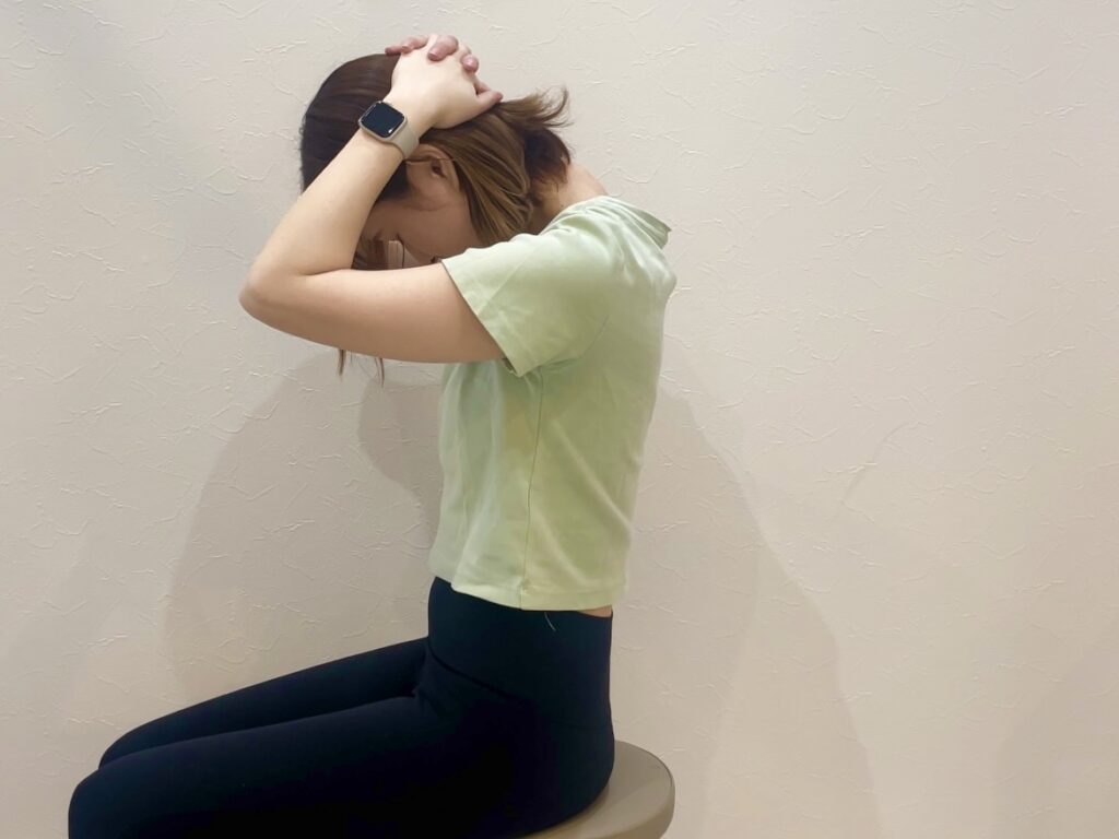 背中をまっすぐ座り両手を頭の後ろで組みます。